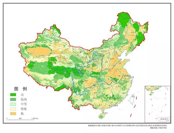 中國東部地區、及西部荒漠地區生態重要性較低,西部高原及未開發地帶,東北地區森林資源豐富,生態重要性較高。中國生態環境的基本狀況是:總體在惡化,局部在改善,治理能力遠遠趕不上破壞速度,生態赤字逐漸擴大。
